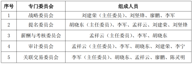 李軍先生經公司股東大會選舉成為該公司獨立董事后,將同時擔任公司第十屆董事會關聯交易委員會主任委員、戰略委員會委員、提名委員會委員、薪酬與考核委員會委員及審計委員會委員的職務,任期與公司第十屆董事會任期一致。調整后公司第十屆董事會專門委員會組成如下: