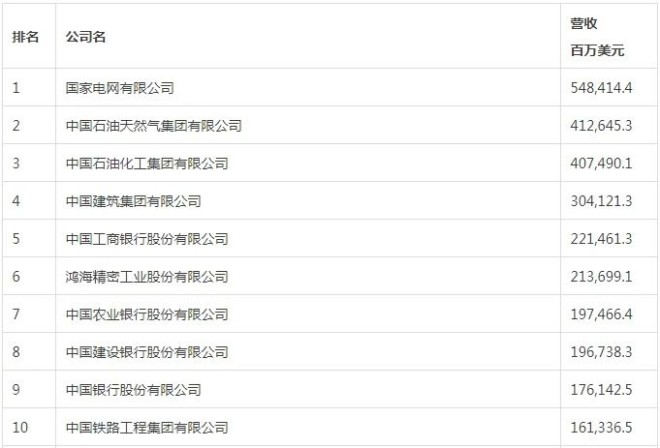 國家電網有限公司以5,484億美元的營收位居榜首,中國石油和中國石化分列榜單第二位和第三位,位列第四位的是中國建筑集團,中國工商銀行位列第五。蘋果最大代工企業鴻海精密位列第六,較去年上升1位,仍是排名最高的臺灣地區公司。今年前十位中,沒有大陸民營企業。京東集團位列第11位,較去年上升2位,仍是排位最高的大陸民營企業。