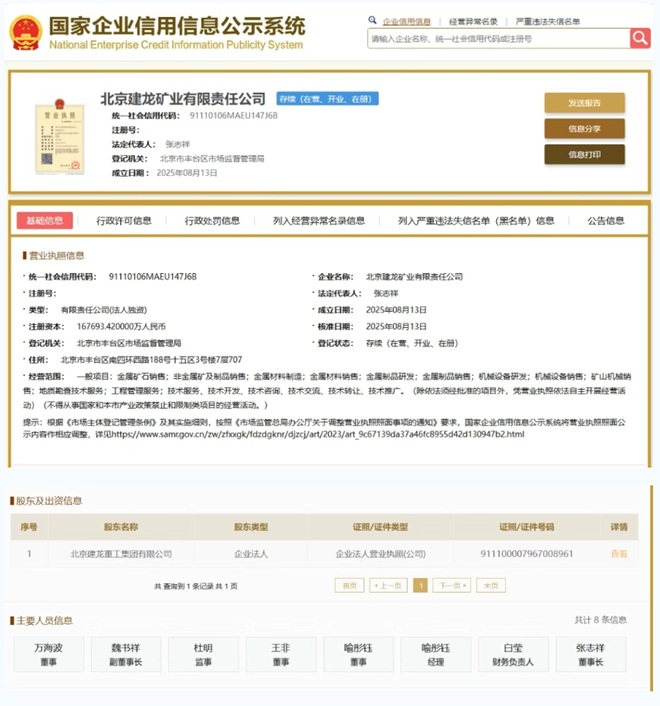 據國家企業(yè)信用信息公示系統(tǒng)顯示,北京建龍重工集團有限公司于8月13日成立全資子公司——北京建龍礦業(yè)有限責任公司,注冊資本約為16.77億元,由建龍集團100%控股,董事長張志祥出任新公司董事長。