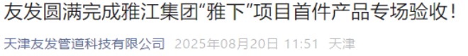 天津友發管道科技有限公司8月20日報道(點擊鏈接查看全文:https://mp.weixin.qq.com/s/FIFRa8ygUa1P4rKrLPtVJg),近日,雅江集團“雅下”項目組領導一行先后蒞臨陜西友發鋼管有限公司、天津友發管道科技有限公司,針對項目所需螺旋防腐保溫鋼管開展首件產品實地驗收工作。經過系統驗收,項目組最終出具結論:友發管道科技承制的“雅下”項目首件產品,關鍵指標全合格、質量文件全合規,首件驗收通過。此次驗收的圓滿完成,標志“雅下”項目正式進入螺旋防腐保溫鋼管實質供貨階段。