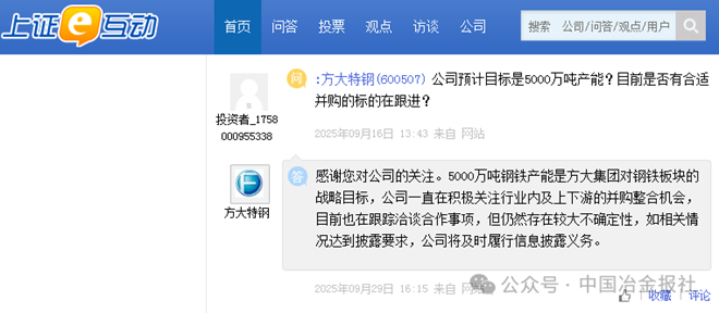 投資者:方大特鋼(600507)公司預計目標是5000萬噸產能?目前是否有合適并購的標的在跟進?