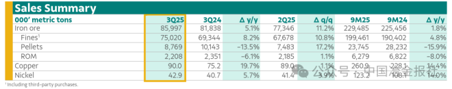 10月22日,淡水河谷官方微信公眾號發布2025年第三季度產銷量報告。
