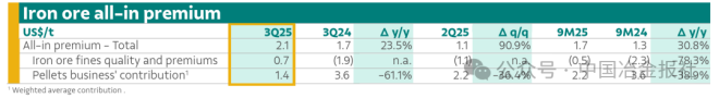 三季度鐵礦石產量總計9440萬噸,同比增長340萬噸,增幅為4%,這得益于S11D礦區創下季度產量新高,以及重點項目持續達產。鐵礦石銷量達到8600萬噸,同比增長420萬噸,增幅為5%。價格實現同時改善,主要得益于鐵礦石粉礦溢價增長(環比增長1.8美元/噸)。球團產量總計800萬噸,同比減少240萬噸,減幅為23%,反映出市場狀況。