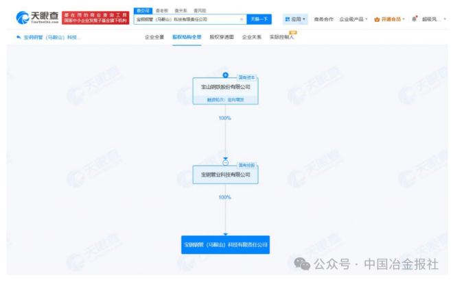 股權(quán)全景穿透圖顯示,該公司由寶鋼管業(yè)科技有限公司全資持股,后者為寶鋼股份全資子公司。
