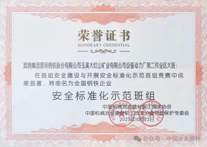 近日,從中國機械冶金建材職工技術(shù)協(xié)會勞動保護專委會傳來振奮人心的喜訊——武昆股份大紅山礦業(yè)設(shè)備動力廠第二作業(yè)區(qū)大班班組憑借在安全標準化建設(shè)、技術(shù)創(chuàng)新及團隊管理等方面的突出表現(xiàn),成功榮獲“全國鋼鐵企業(yè)安全標準化示范班組”榮譽稱號,為大紅山礦業(yè)公司贏得了國家級榮譽。