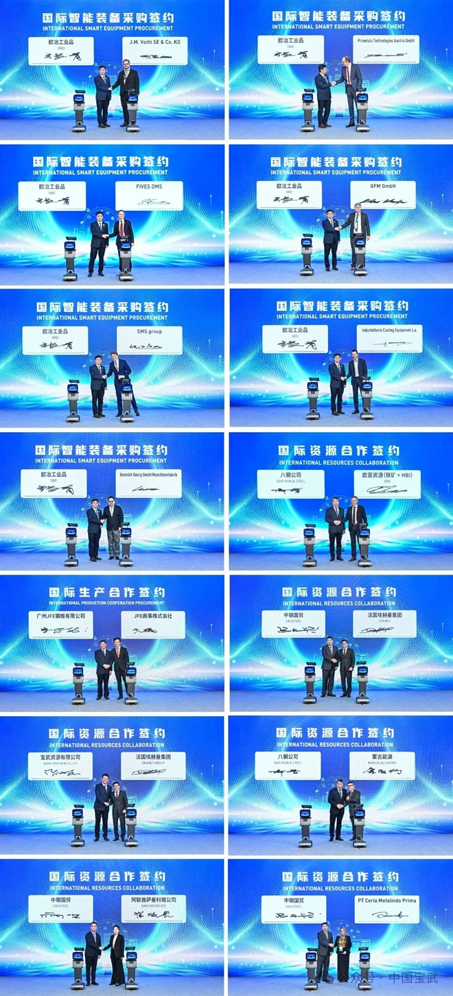 簽約儀式分5個批次進行,覆蓋多元合作領域,成果豐碩。首批簽約聚焦國際智能裝備采購,歐冶工業品與普銳特、法孚、GFM、西馬克等七家全球知名裝備制造商簽署合作協議。隨后進行的國際生產合作簽約中,GJSS與JFE商事株式會社就進一步深化合作達成一致。在備受關注的國際資源合作環節,簽約分三個批次進行,涉及寶武資源、中鋼國貿等寶武旗下子公司,合作伙伴包括法國埃赫曼集團、歐亞資源集團、蒙古能源、阿聯酋薩曼科鉻公司、印尼鎳礦公司等國際知名資源企業。一場場簽約,不僅是一紙紙合同,更是寶武與全球伙伴同向而行、相互成就的堅實步伐,為保障產業鏈供應鏈韌性注入了澎湃動力。