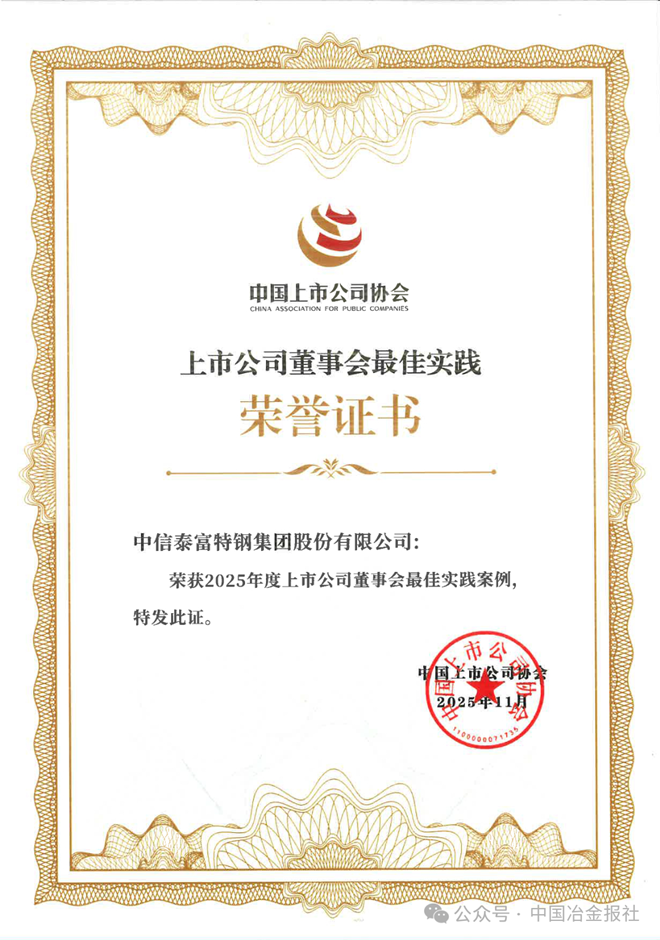 為促進(jìn)上市公司董事會(huì)依法合規(guī)運(yùn)作,提升上市公司治理效能,中國上市公司協(xié)會(huì)開展了“2025上市公司董事會(huì)最佳實(shí)踐案例征集活動(dòng)”。經(jīng)初審、專家委員會(huì)評審、誠信核查等環(huán)節(jié),中信泰富特鋼集團(tuán)(股票簡稱:中信特鋼)董事會(huì)榮獲“上市公司董事會(huì)最佳實(shí)踐”。