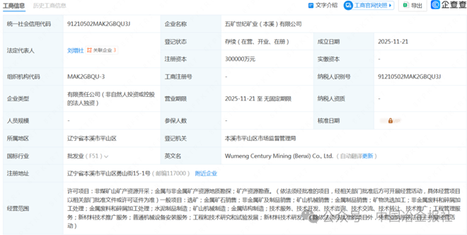 企查查消息,2025年11月21日,五礦世紀礦業(本溪)有限公司成立,法定代表人為劉增社,注冊資本30億元,由中國五礦集團旗下五礦礦業控股有限公司全資持股。該公司經營范圍包含非煤礦山礦產資源開采、金屬與非金屬礦產資源地質勘探、礦產資源勘查等。
