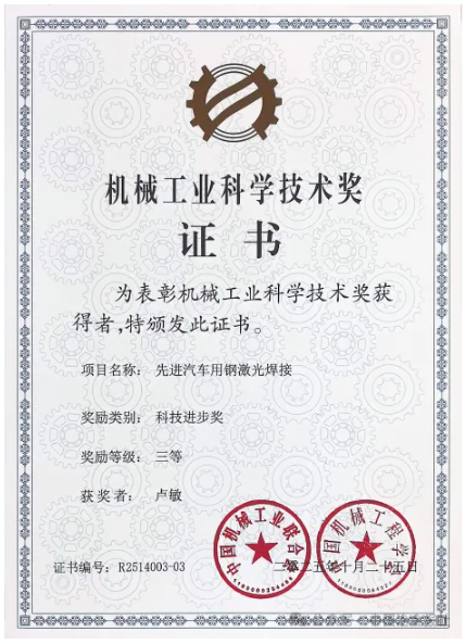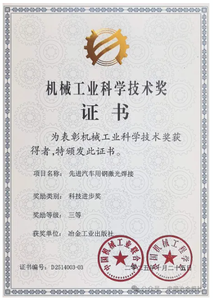 洪雙教授領(lǐng)銜完成的學(xué)術(shù)專著《先進(jìn)汽車用鋼激光焊接》,憑借在汽車用鋼激光焊接領(lǐng)域的系統(tǒng)性創(chuàng)新與產(chǎn)業(yè)化貢獻(xiàn),近日榮獲機械工業(yè)科技進(jìn)步獎三等獎,成為行業(yè)技術(shù)創(chuàng)新與知識傳播深度融合的優(yōu)秀范例。