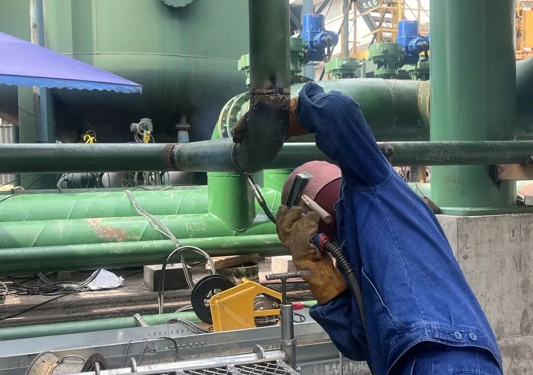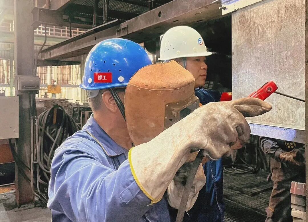 焊槍的嗞嗞聲與兩人簡短的對話交織在一起,焊花隨著焊槍的移動不斷迸發,橘紅色的光團格外醒目。