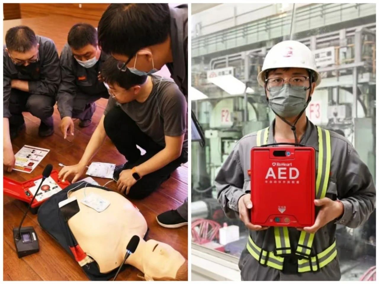除了日常健康管理,突發狀況的應急處置同樣關鍵。2022年,敬業集團采購46臺半自動體外除顫器(AED),精準布點在廠區重要站點、酒店、景區、學校等人員密集場所,為生命搶救爭取黃金時間。為讓全員“會用、敢用”AED,健康管理中心邀請專業人員為全員講解院前急救、心肺復蘇及 AED 操作步驟并驗收,讓急救技能成為全員必備的“生命護身符”。