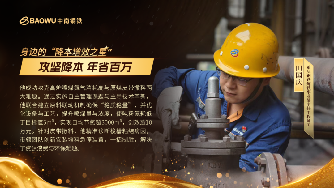 田國慶,重慶鋼鐵煉鐵事業部高爐噴煤凈化車間煉鐵工藝主任工程師。在煉鐵事業部,他的名字已成為“創新”的代名詞。近期,面對降低高爐噴煤氮氣消耗和根治原煤貯運系統皮帶機撒料兩大難題,他通過實施自主管理課題、主導技術革新,不僅成功消除了皮帶撒料頑疾,更在6月份將噸粉氮氣消耗降低至目標值以下5立方米,日均節氮超3000立方米,創效逾10萬元。
