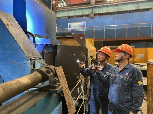 ?9月7日16:00,方大特鋼軋鋼廠設備部部長陽志清,帶徒弟劉羅軍到軋鋼廠彈扁線巡檢。在新投用的1300噸冷剪旁,劉羅軍問:“師傅,冷剪設備最需要關注的是銅滑板磨損情況,可銅滑板在冷剪本體內,看不見摸不著,如何點檢保證潤滑到位呢?”面對劉羅軍的疑問,陽志清帶著他查看冷剪東側的溫度巡檢儀,指出銅滑板內裝有熱電阻可實時監測溫度,正常40-50℃,超溫則需檢查線路和潤滑情況;又走到冷剪西側指著干油自動潤滑系統,講解其功能及異常處理。師徒邊點檢邊教學,言行中滿是精細保障設備穩定運行的專注。(張剛)