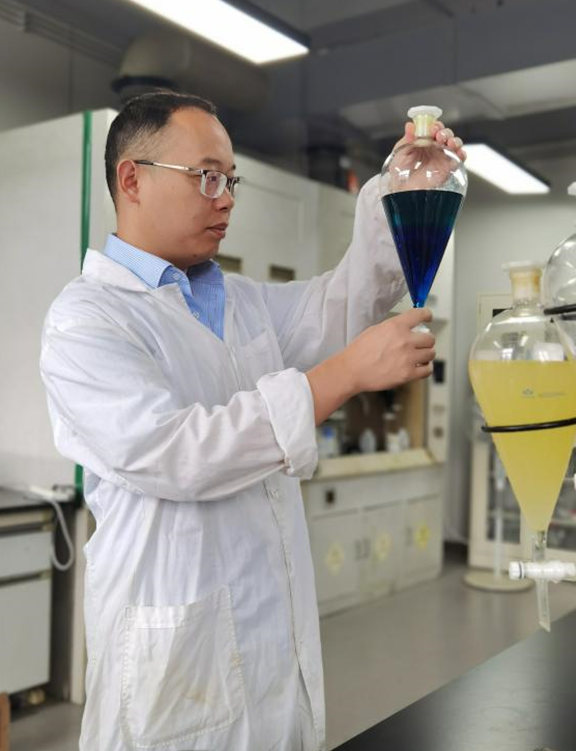 如何從高純釩到高品質釩,汪勁鵬深入研究了水、銨循環的影響,通過多輪試驗有效減少了水處理量和銨耗量,以一段溶解+多段除雜的方式,實現了Fe、Mn、P、Si、K、Na等雜質的深度去除。他創新了全濕法短流程制備釩電解液技術路線,解決了精制尾渣中釩鈦高效分離的技術難題,同時通過萃取對浸出液進行了凈化富集,制備出釩濃度1.8mol/L,雜質含量滿足國標一等品要求的硫酸氧釩電解液,實現了含釩精制尾渣的高值化利用。目前已順利完成十公斤級試驗,百公斤級擴試線也正在加緊建設中,用于系統驗證工藝路線在規模化生產條件下的可靠性與經濟性,為后續產業化應用提供關鍵數據支撐并奠定堅實基礎。