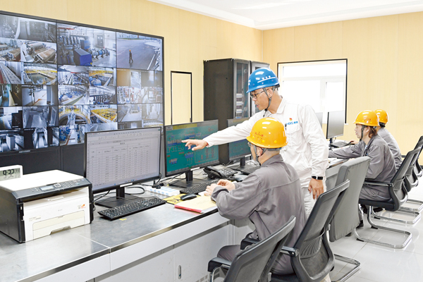 圖為攻關(guān)團(tuán)隊(duì)成員在中控室分析工藝優(yōu)化后的生產(chǎn)數(shù)據(jù)。