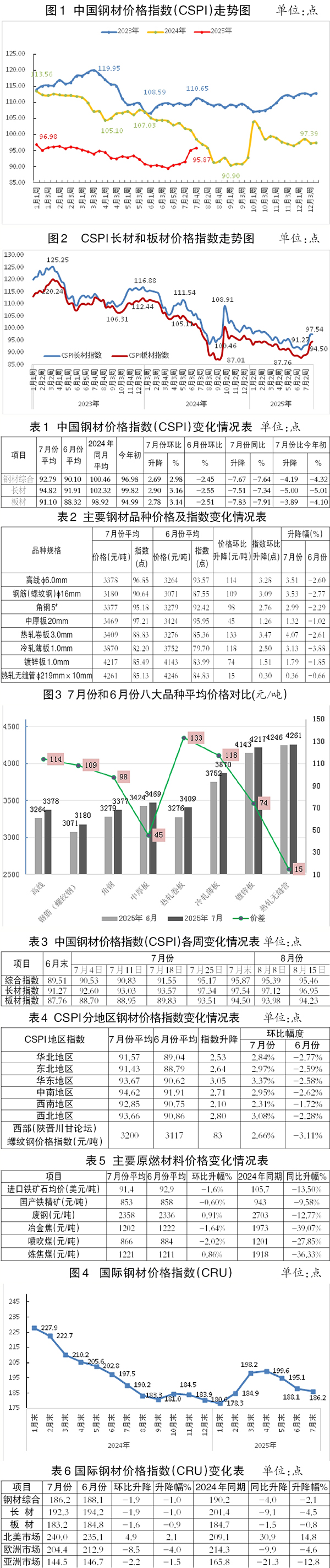 7月末,CSPI長材指數(shù)為97.54點,環(huán)比上升6.27點、升幅為6.87%;CSPI板材指數(shù)為94.50點,環(huán)比上升6.74點、升幅為7.68%。上年同期相比,CSPI長材、板材指數(shù)分別下降0.81點、1.07點,降幅分別為0.82%、1.12%。
