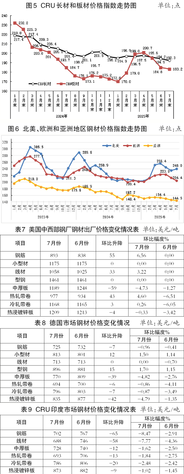 1月—7月份,CRU國際鋼材價格指數(shù)平均值為190.1點,同比下降18.1點、降幅為8.7%。其中,CRU長材指數(shù)平均值為195.4點,同比下降15.4點、降幅為7.3%;CRU板材指數(shù)平均值為187.4點,同比下降19.4點、降幅為9.4%。