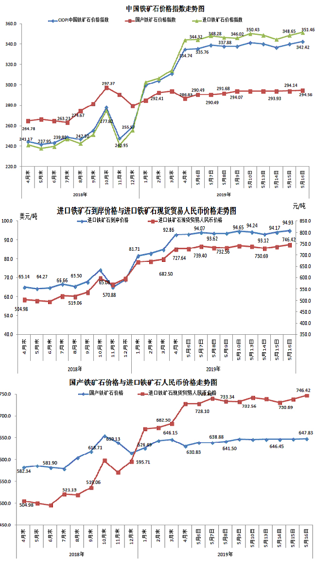 5月16日,中國鐵礦石價格指數(CIOPI)342.42點,環比上升2.43點,升幅為0.72%。其中:國產鐵礦石價格指數為294.56點,環比上升0.42點,升幅為0.14%;進口鐵礦石價格指數為351.46點,環比上升2.81點,升幅為0.81%。