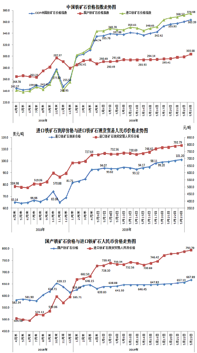 5月23日,中國鐵礦石價格指數(CIOPI)363.39點,環比上升3.24點,升幅為0.90%。其中:國產鐵礦石價格指數為303.68點,環比上升4.89點,升幅為1.64%;進口鐵礦石價格指數為374.68點,環比上升2.92點,升幅為0.79%。