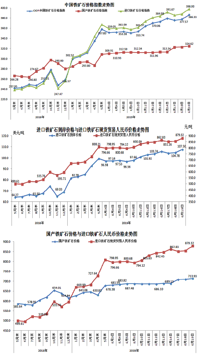 6月19日,中國鐵礦石價格指數(CIOPI)386.33點,環比上升8.77點,升幅為2.32%。其中:國產鐵礦石價格指數為324.62點,環比上升1.87點,升幅為0.58%;進口鐵礦石價格指數為398.00點,環比上升10.07點,升幅為2.60%。