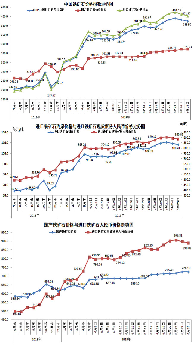 6月25日,中國鐵礦石價(jià)格指數(shù)(CIOPI)389.90點(diǎn),環(huán)比下降2.94點(diǎn),降幅為0.75%。其中:國產(chǎn)鐵礦石價(jià)格指數(shù)為329.24點(diǎn),環(huán)比上升0.11點(diǎn),升幅為0.03%;進(jìn)口鐵礦石價(jià)格指數(shù)為401.37點(diǎn),環(huán)比下降3.52點(diǎn),降幅為0.87%。