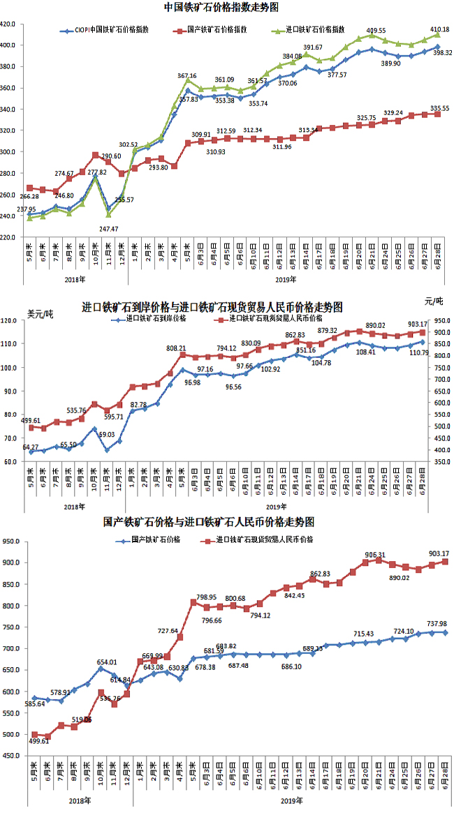 6月28日,中國鐵礦石價格指數(CIOPI)398.32點,環比上升4.35點,升幅為1.11%。其中:國產鐵礦石價格指數為335.55點,環比上升0.36點,升幅為0.11%;進口鐵礦石價格指數為410.18點,環比上升5.11點,升幅為1.26%。