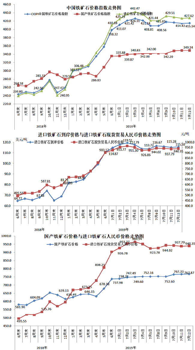 7月12日,中國鐵礦石價格指數(CIOPI)415.14點,環比上升0.72點,升幅為0.17%。其中:國產鐵礦石價格指數為349.14點,環比上升0.25點,升幅為0.07%;進口鐵礦石價格指數為427.62點,環比上0.81點,升幅為0.19%。