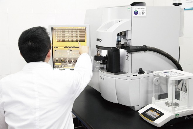 圖為質(zhì)管處工作人員利用先進(jìn)氧氮分析儀對(duì)產(chǎn)品進(jìn)行分析檢測(cè)。