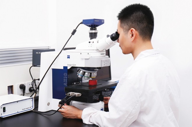 圖為質(zhì)管處相關(guān)人員運(yùn)用全自動(dòng)顯微鏡設(shè)備開(kāi)展質(zhì)量檢測(cè)。