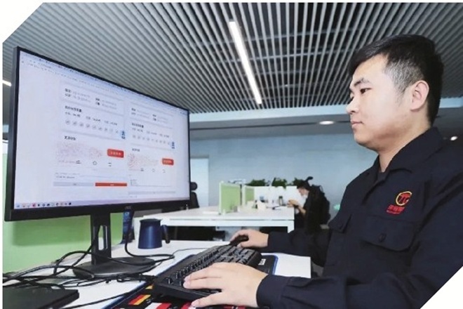 圖為榮程智運(yùn)工作人員在后臺(tái)查看實(shí)時(shí)車(chē)輛運(yùn)輸情況。(榮程集團(tuán) 供圖)