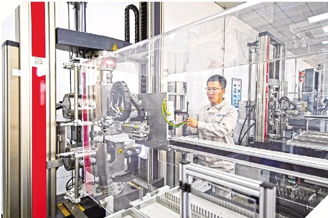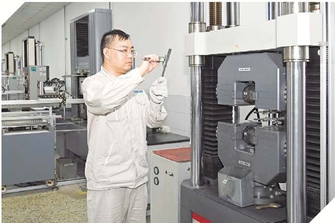 圖為河鋼集團(tuán)唐鋼公司質(zhì)量管理部技術(shù)人員正在操作拉伸試驗(yàn)機(jī),檢測(cè)750CL車輪鋼質(zhì)量。(趙輝 攝)