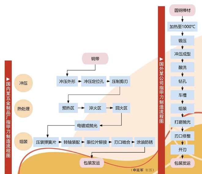 中外兩家企業(yè)生產的指甲刀結構類型不同,生產工藝也有著明顯區(qū)別。國內企業(yè)用沖壓方式生產,材料為鋼板;而國外企業(yè)用鍛造方式生產,材料為圓鋼。兩家企業(yè)生產線視頻的宣傳重點也不同,國內企業(yè)主打生產線自動化,國外企業(yè)則注重宣傳手工打磨、精打細磨。這反映了兩家企業(yè)對指甲刀的市場定位不同。
