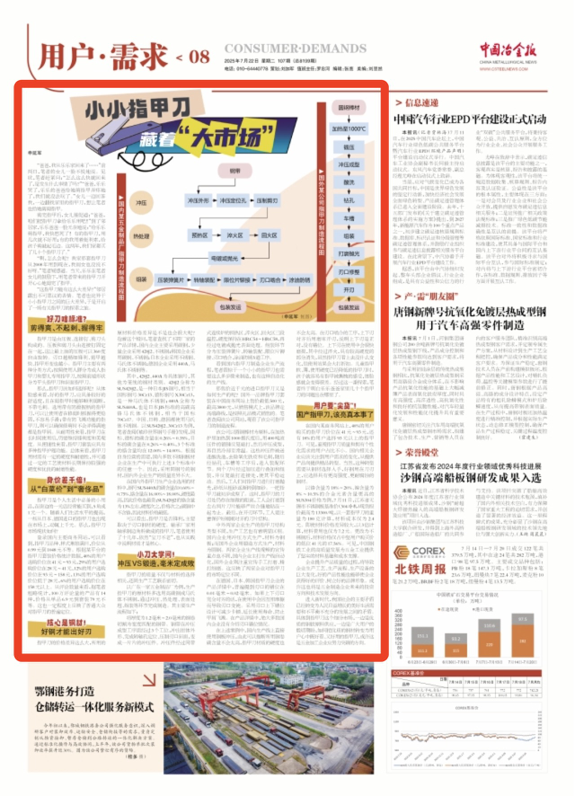 在國內某商務網站上,40%的用戶購買的指甲刀價位在41元~93元,還有18%的用戶選擇93元以上的指甲刀。可見,重視指甲刀質量和擁有個性化需求的用戶占比不小。國內相關企業(yè)應該關注到用戶需求的變化,從提供產品向提供精品轉型。當然,這種轉型需要從鋼材選擇入手,好鋼用在刀刃上,應選擇具有更高強度、更耐腐蝕的鋼材。