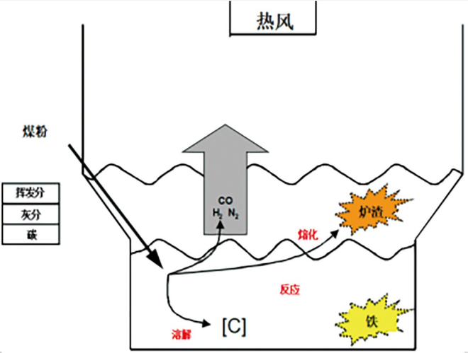 鐵水熔池中反應產生的CO(g)、煤中揮發分裂解產生的H2和噴吹N2形成混合氣,與上部讓熱風噴槍送來的富氧熱風(約1200℃,40%O2)相遇產生劇烈燃燒反應(即二次燃燒過程),還原性CO、H2等與爐內的氧氣反應,產生二氧化碳和水蒸氣,同時放出大量的熱量。這些熱量被傳遞給爐內的還原反應,維持熔融還原爐的高溫狀態。
