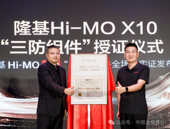 發(fā)布會(huì)上,CPVT副主任朱曉崗代表CPVT為隆基綠能Hi-MO X10授予“三防”組件檢測(cè)證書(shū),這是光伏行業(yè)首個(gè)“三防組件”的權(quán)威測(cè)試,旨在證明“三防”組件所具備的卓越性能,對(duì)促進(jìn)行業(yè)技術(shù)進(jìn)步和高質(zhì)量發(fā)展具有重要意義。