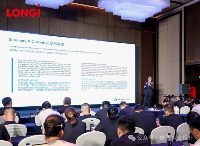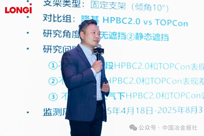 圖為北京鑒衡認(rèn)證中心有限公司太陽(yáng)能事業(yè)部技術(shù)總監(jiān)朱晨分享《HPBC 2.0組件多場(chǎng)景多維度發(fā)電特性實(shí)證報(bào)告》