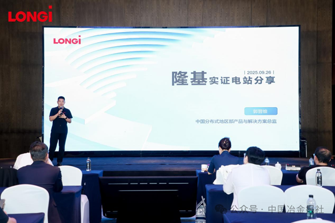 圖為隆基綠能中國(guó)分布式地區(qū)部產(chǎn)品與解決方案總監(jiān)郭晉維作《隆基實(shí)證電站分享》的報(bào)告