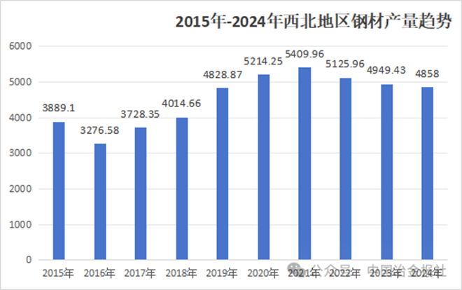 國家統計局數據顯示,2015-2024年,西北五省(陜西、甘肅、青海、寧夏、新疆)鋼材產量呈現“先增后穩”趨勢:2015 年總產量3889.1萬噸,2021年達到峰值5409.96萬噸,2024年回落至4858萬噸,整體符合國家鋼鐵產業“去產能、優結構”的導向。