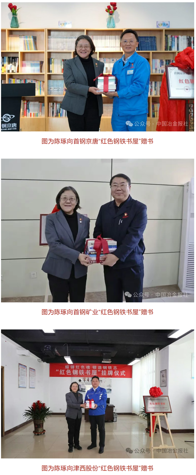 在首鋼京唐、首鋼礦業和津西股份,與會領導共同為“紅色鋼鐵書屋”揭牌,并實地調研書屋建設成果。各書屋規劃科學、功能完善,藏書涵蓋紅色經典、專業冶金、文學藝術及生活科普等多個門類,實現了思想性、專業性與實用性的有機融合,營造出濃郁書香和厚重文化氛圍。活動中,冶金工業出版社還向各企業贈送了一批涵蓋黨建理論、行業前沿與科技創新等領域的精品圖書,進一步豐富了書屋的知識資源。