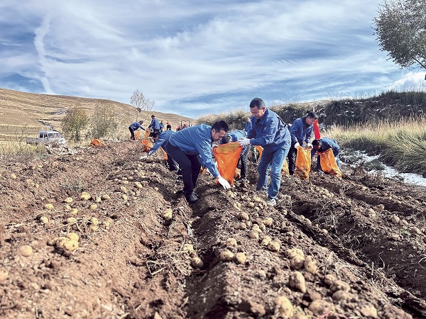 2023年10月中旬以來(lái),甘肅省武威市古浪縣山區(qū)氣溫急劇下降,酒鋼集團(tuán)幫扶鄉(xiāng)鎮(zhèn)古浪縣橫梁鄉(xiāng)部分農(nóng)戶土豆面臨滯銷。酒鋼鄉(xiāng)村振興駐村幫扶工作站快速響應(yīng),組織全體駐村干部在古浪縣南部山區(qū)馬鈴薯種植基地開展“為民辦實(shí)事”幫銷活動(dòng)。在此次活動(dòng)中,酒鋼鄉(xiāng)村振興駐村幫扶工作站共計(jì)幫銷馬鈴薯35余噸。圖為酒鋼駐村干部在幫助村民收土豆。(王斌先 攝)