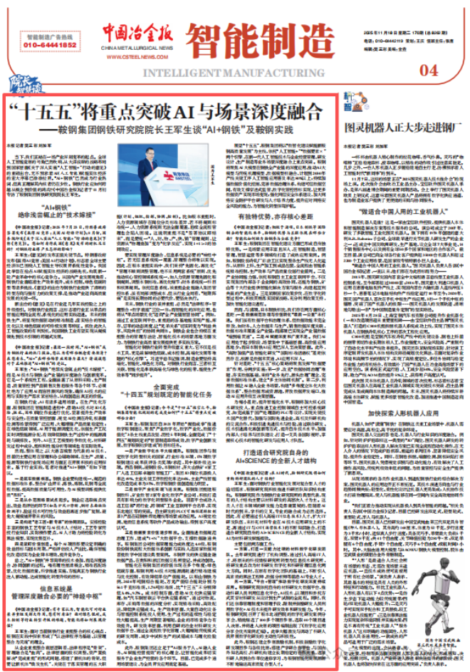 當(dāng)下,我們正站在一場(chǎng)產(chǎn)業(yè)深刻變革的起點(diǎn)。全球人工智能競(jìng)賽的號(hào)角已然吹響,從大洋彼岸的戰(zhàn)略布局到國(guó)家層面《關(guān)于深入實(shí)施“人工智能+”行動(dòng)的意見(jiàn)》的重磅出臺(tái),無(wú)不預(yù)示著AI(人工智能)賦能實(shí)體經(jīng)濟(jì)的宏大序幕已徐徐拉開(kāi)?!癆I+鋼鐵”已然成為行業(yè)熱詞,但真正理解其內(nèi)核者仍在少數(shù)。鋼鐵行業(yè)應(yīng)如何跨越從概念到價(jià)值的鴻溝?《中國(guó)冶金報(bào)》記者于11月初專訪了鞍鋼集團(tuán)鋼鐵研究院院長(zhǎng)王軍生。
