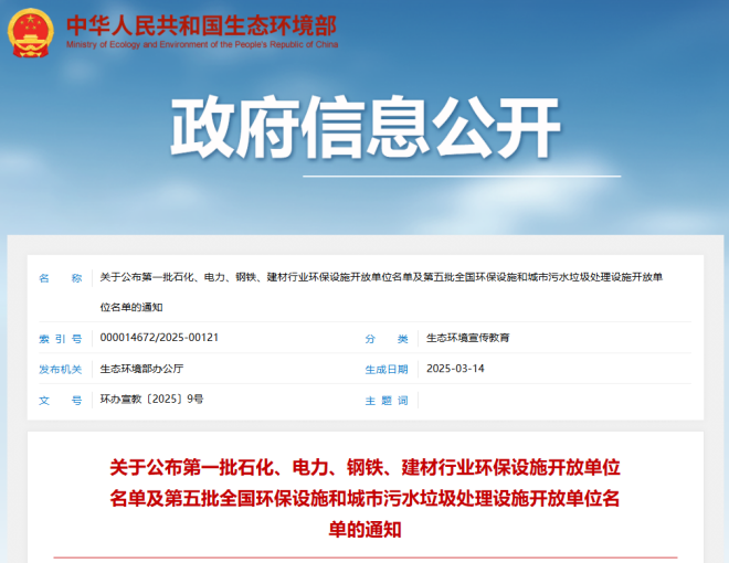 近日,生態環境部網站發布了《關于公布第一批石化、電力、鋼鐵、建材行業環保設施開放單位名單及第五批全國環保設施和城市污水垃圾處理設施開放單位名單的通知》(以下簡稱《通知》)。