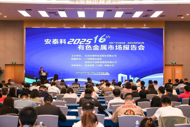 4月29日,安泰科2025年(第十六屆)有色金屬市場報告會在北京鐵道大廈召開,會議深入解析有色金屬市場熱點,研判金屬價格走向,挖掘未來發展機遇,促推有色金屬產業加速轉型升級。本次會議由北京安泰科信息股份有限公司主承辦,得到了廣州期貨交易所、深圳市中金嶺南期貨有限公司、托克投資(中國)有限公司的大力支持。
