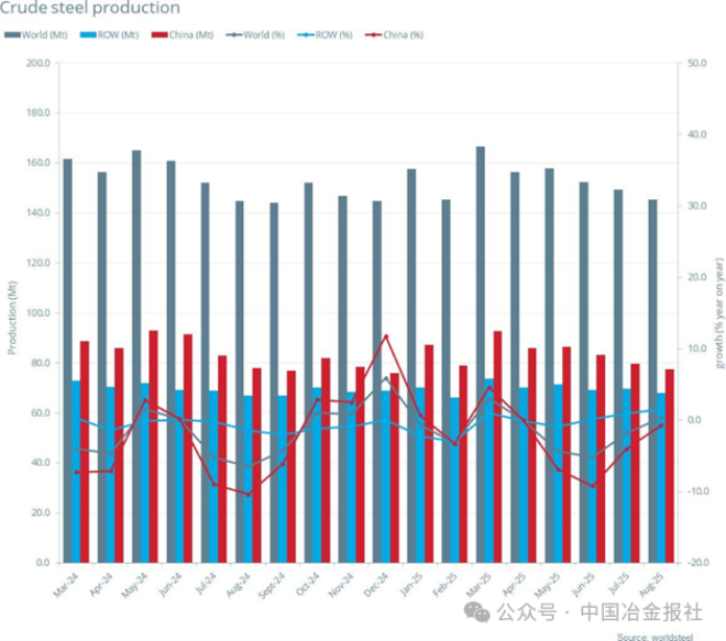 2025年8月全球70個(gè)納入世界鋼鐵協(xié)會(huì)統(tǒng)計(jì)國(guó)家/地區(qū)的粗鋼產(chǎn)量為1.453億噸,同比提高0.3%