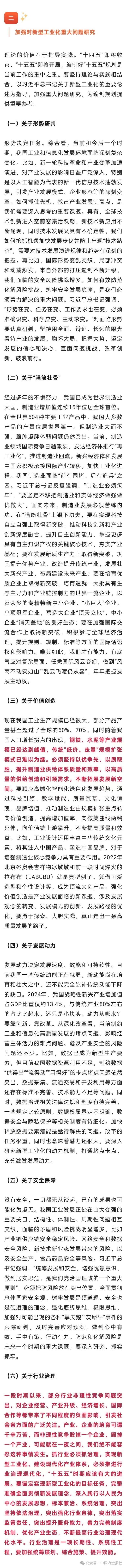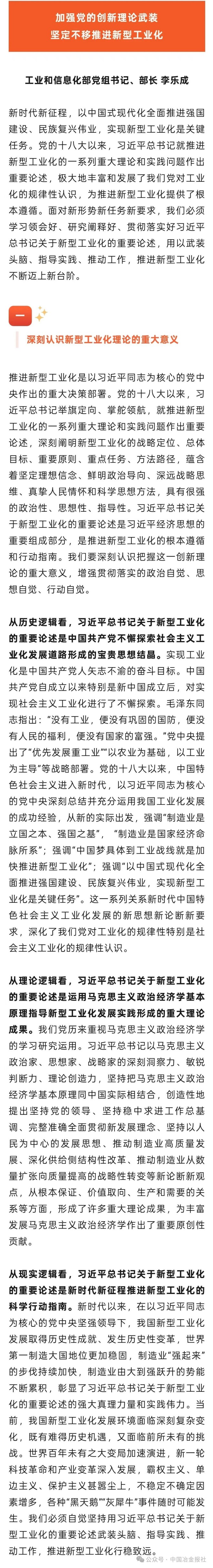 近日,工業(yè)和信息化部黨組書記、部長李樂成在《新型工業(yè)化》期刊上發(fā)表署名文章《加強黨的創(chuàng)新理論武裝 堅定不移推進新型工業(yè)化》。文中指出,現(xiàn)在我國工業(yè)生產(chǎn)規(guī)模已經(jīng)很大,部分產(chǎn)品產(chǎn)量甚至超過了全球的60%、70%,同時隨著我國人口增長拐點的出現(xiàn),鋼鐵、水泥等產(chǎn)業(yè)規(guī)模已經(jīng)達到峰值,傳統(tǒng)“低價、走量”規(guī)模擴張模式已難以為繼。必須堅持以優(yōu)爭先、以質(zhì)取勝,提升制造業(yè)供給體系質(zhì)量和效率,以高質(zhì)量的供給創(chuàng)造和引領需求,不斷拓展發(fā)展新空間。要順應高端化智能化綠色化發(fā)展趨勢,通過科技引領、數(shù)字賦能、質(zhì)量筑基、文化鑄魂、品牌增值,推動制造業(yè)由規(guī)模擴張重點轉(zhuǎn)向價值創(chuàng)造,提高增加值率,向微笑曲線兩端延伸,向價值鏈上游攀升,不斷提高質(zhì)量和效益。