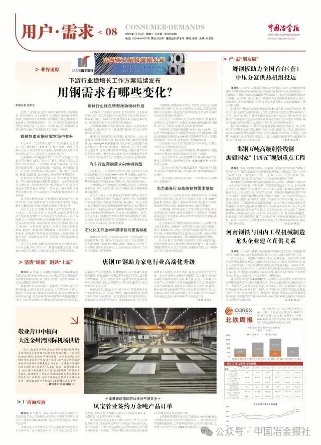 近期,工業(yè)和信息化部、國家發(fā)展改革委、國家能源局、自然資源部、生態(tài)環(huán)境部、住房城鄉(xiāng)建設(shè)部、水利部等部門相繼印發(fā)下游用鋼行業(yè)穩(wěn)增長工作方案(2025—2026年),并積極推進落實。這一系列政策在鋼鐵及鋼材貿(mào)易領(lǐng)域引起廣泛關(guān)注。業(yè)內(nèi)普遍認為,隨著相關(guān)方案的貫徹實施,下游用鋼需求有望進一步釋放。