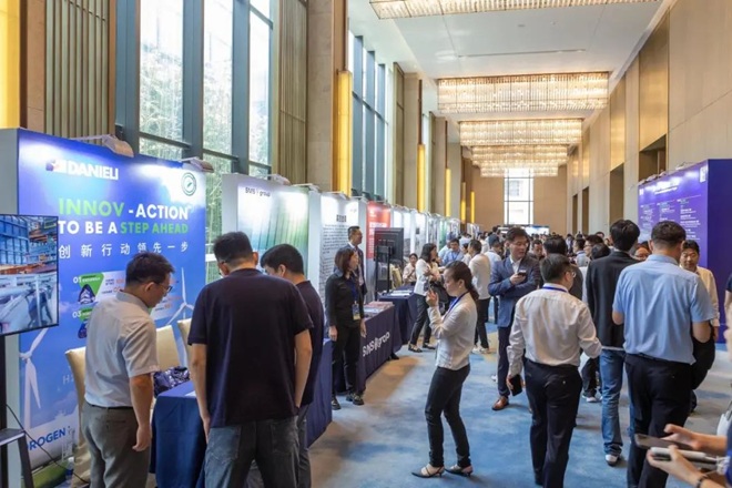圖為會場外各企業的展臺吸引了與會者駐足觀看