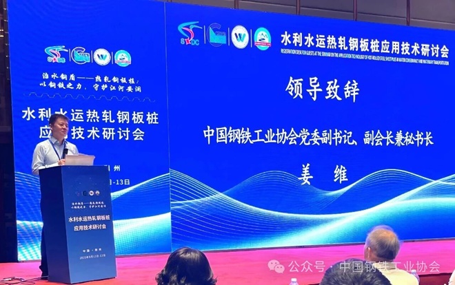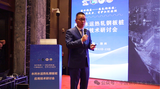 熱軋鋼板樁應用技術推廣工作組主任委員韓亞坤在大會發言中,以“從起步到突破,以協同促發展” 為核心,全面梳理工作組自 2023年10月成立以來的實踐成果,并明確未來深耕水利領域的方向,為產業融合注入信心。