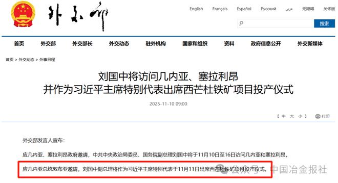 11月10日,外交部網(wǎng)站發(fā)布《劉國中將訪問幾內亞、塞拉利昂并作為習近平主席特別代表出席西芒杜鐵礦項目投產儀式》一文。