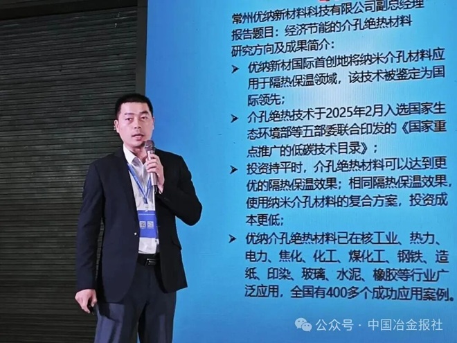圖為常州優納新材料科技有限公司副總經理葛兵做《經濟節能的介孔絕緣材料》報告